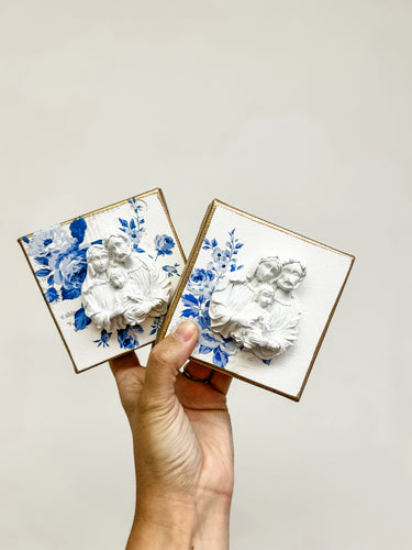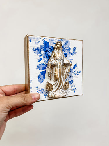 Blue and white 5x5 Mary on canvas- Sacred Designs