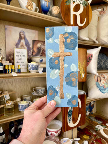 Slate blue and gold Floral textured gold leaf cross- Stretched Out Designs by Chelse Breaux