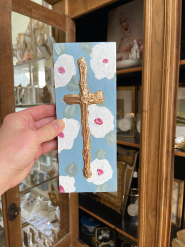 White / blue Floral textured gold leaf cross- Stretched Out Designs by Chelse Breaux