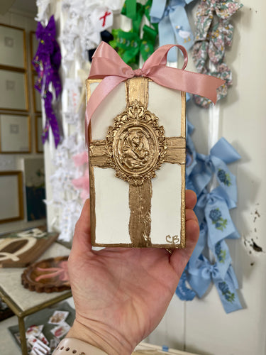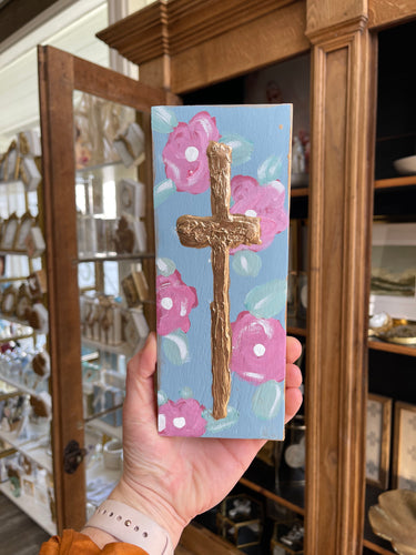 Pink Floral textured gold leaf cross- Stretched Out Designs by Chelse Breaux