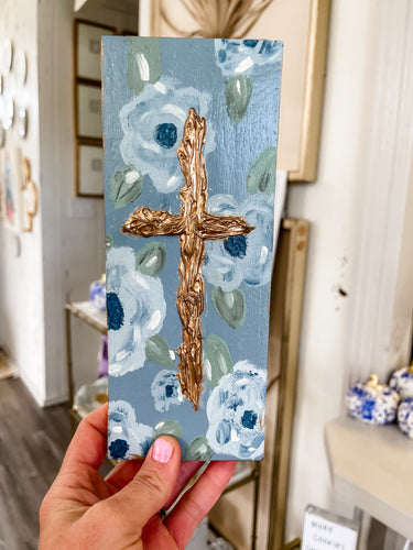 Blue flowers with textured gold leaf cross (F)- Stretched Out Designs by Chelse Breaux