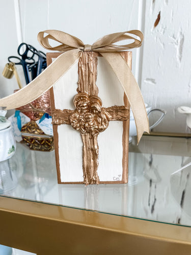 6x3.5 Mary and baby Jesus intaglio on textured gold painted cross with ivory bow -Stretched Out Designs By Chelse Breaux