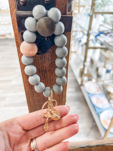 Gold and light grey rustic wood bead wristlet keychain with sacred heart of Jesus pendant and crucifix-Stretched Out Designs By Chelse Breaux