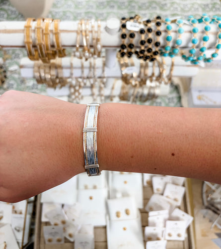 Wide silver hammered center 2 gold twist 2 silver flat bracelet- Q’s Jewelry Design
