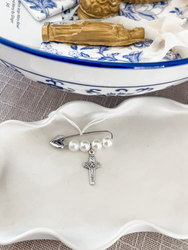 Silver heart pin with pearls and crucifix- The Gilded Mosquito by Lisa Leger