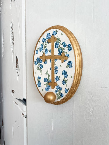 Blue Floral Gold Cross Rosary Hanger- Hope’s Blessed Mess